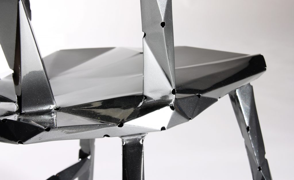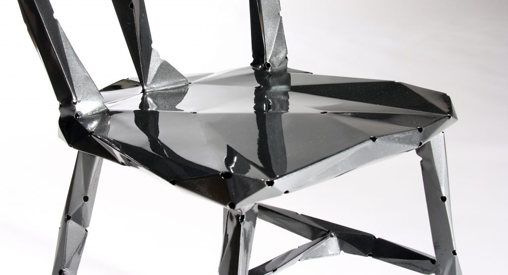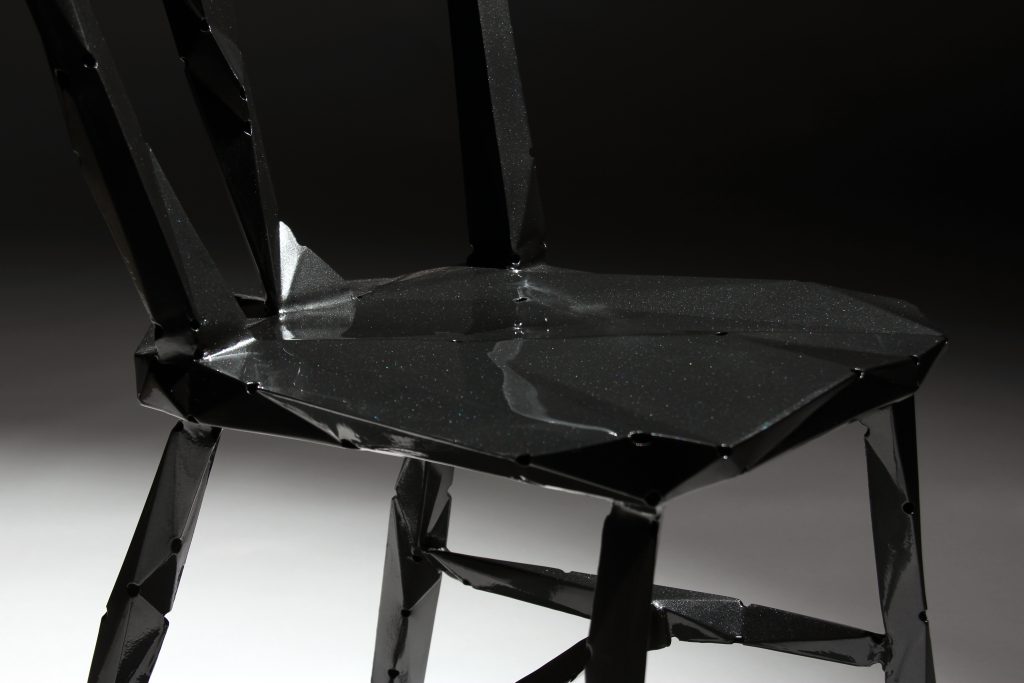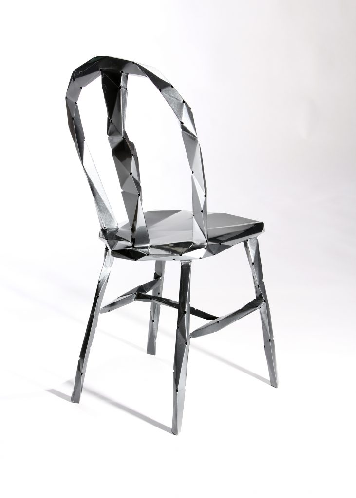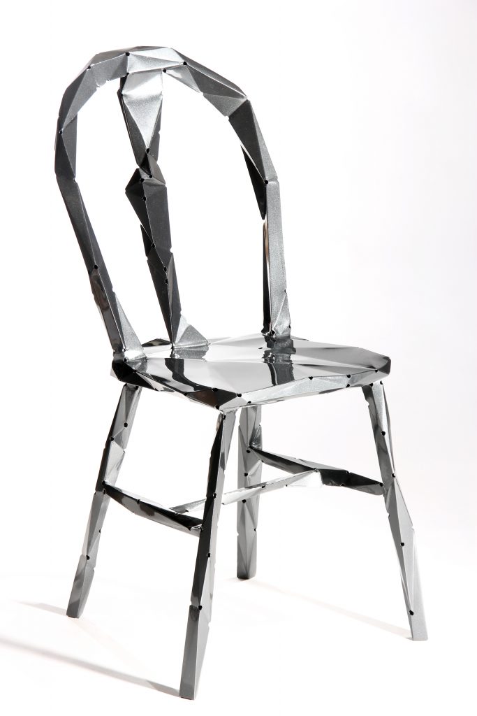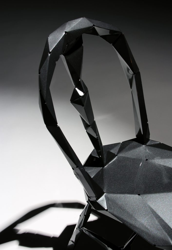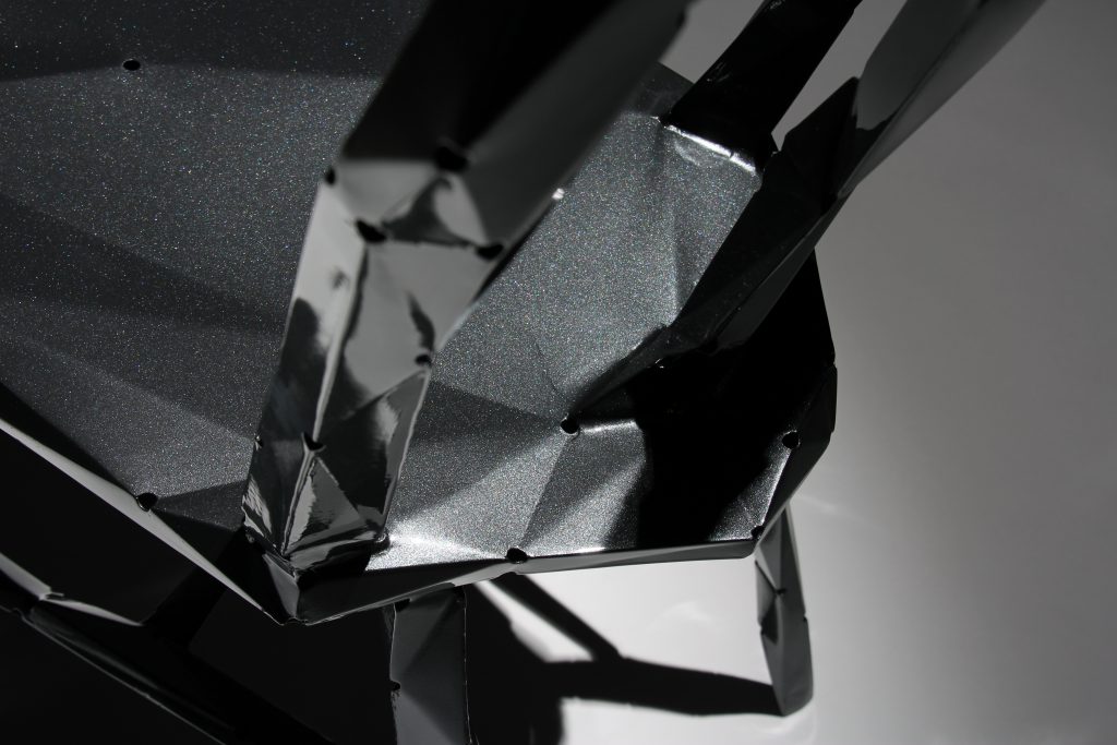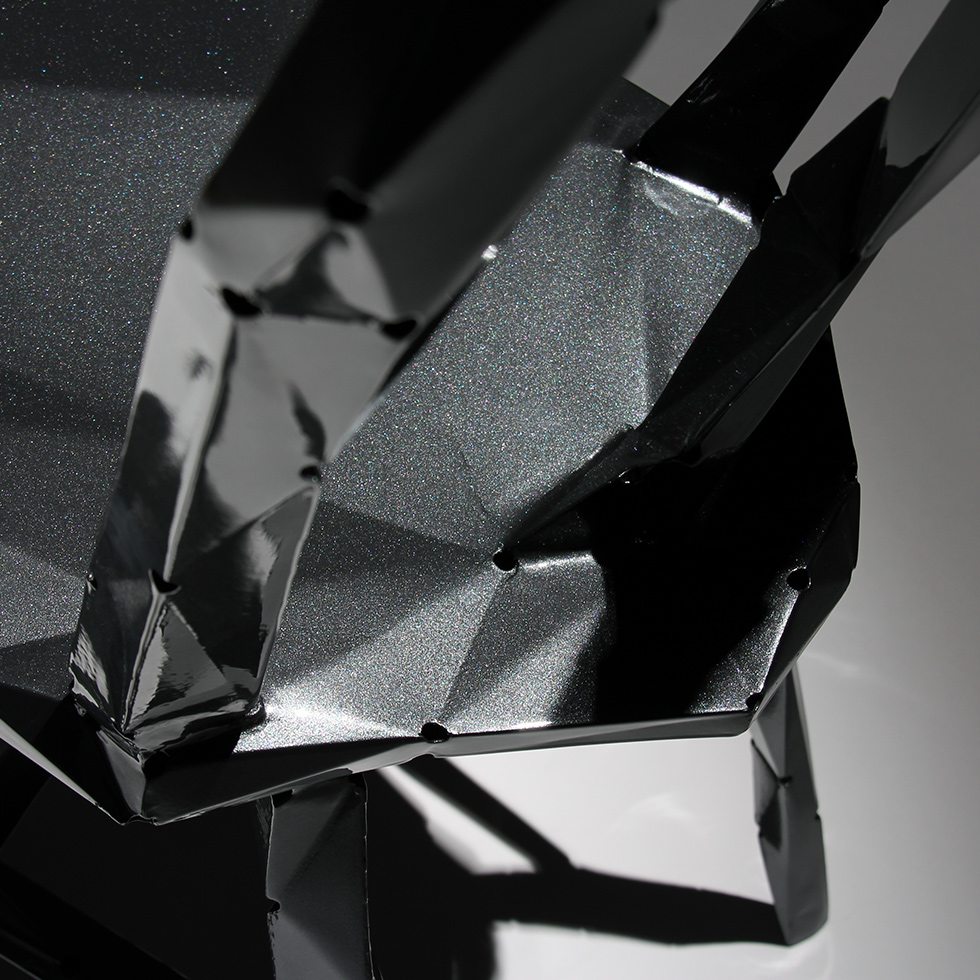 The original Windsor chair was 3D scanned and digitally transformed and its rounded wooden form was distilled into hard angular metal. The folds make 0.9 mm mild steel sheet very strong and together with a shiny car paint they give the chair a jewel-like appearance with its facets reflecting the light so that its form changes slightly from every angle.