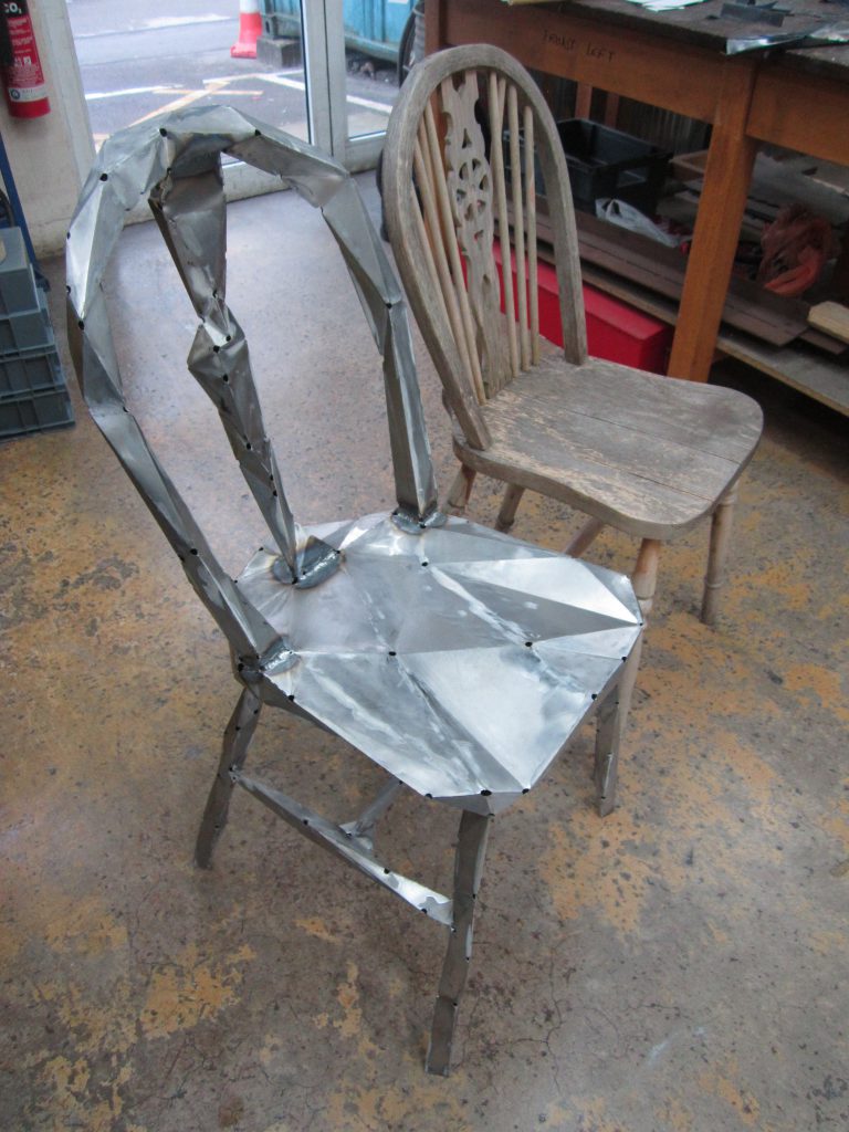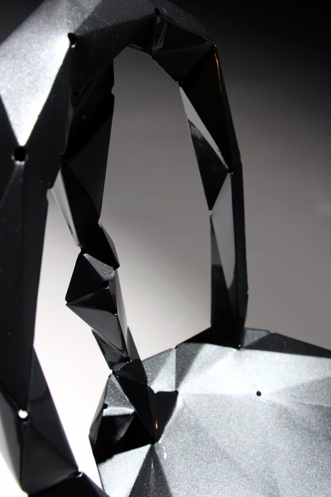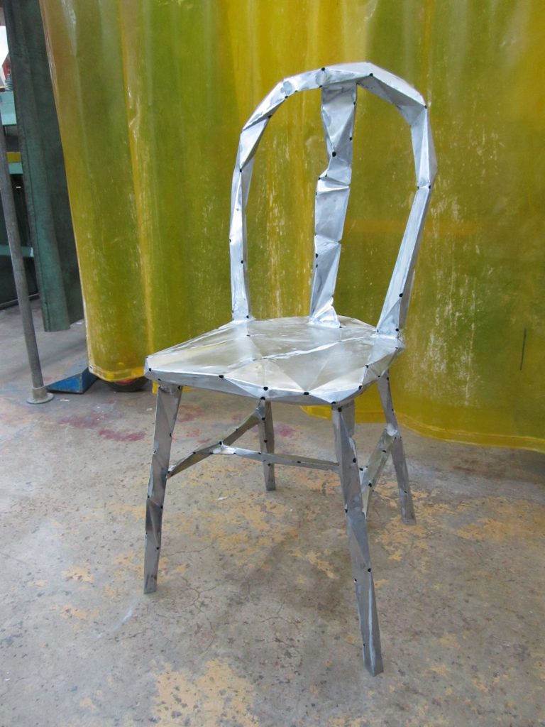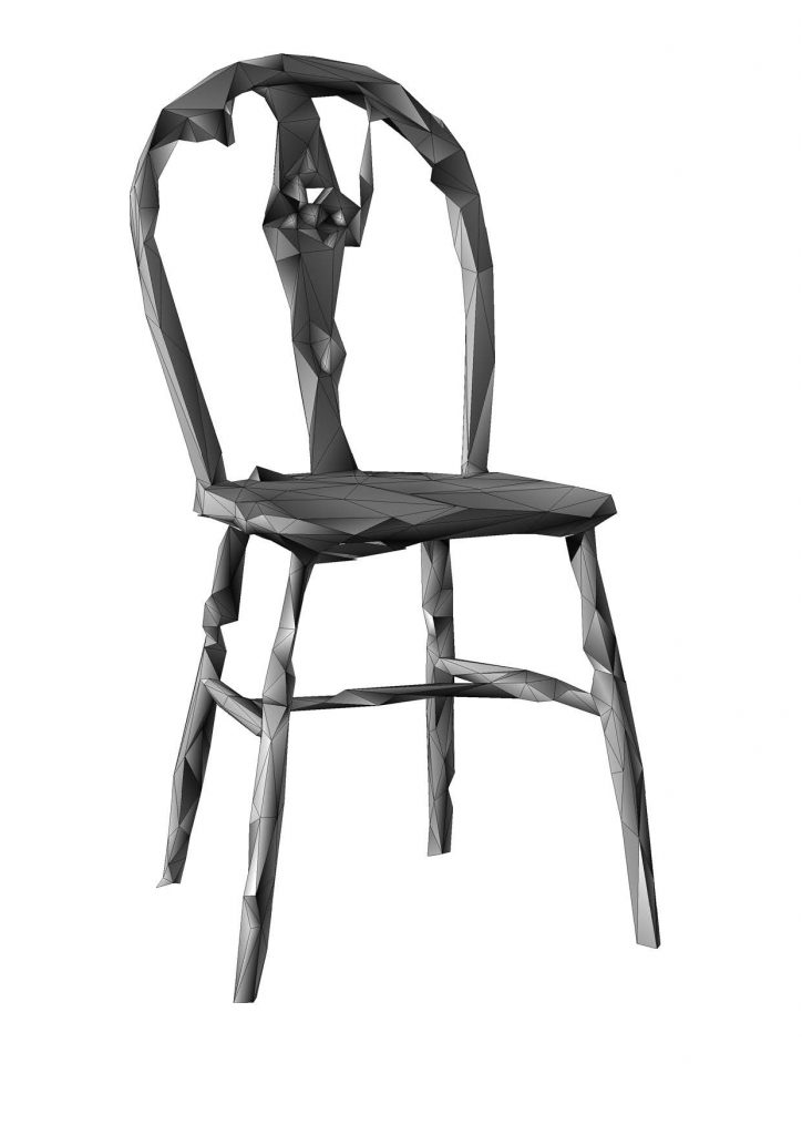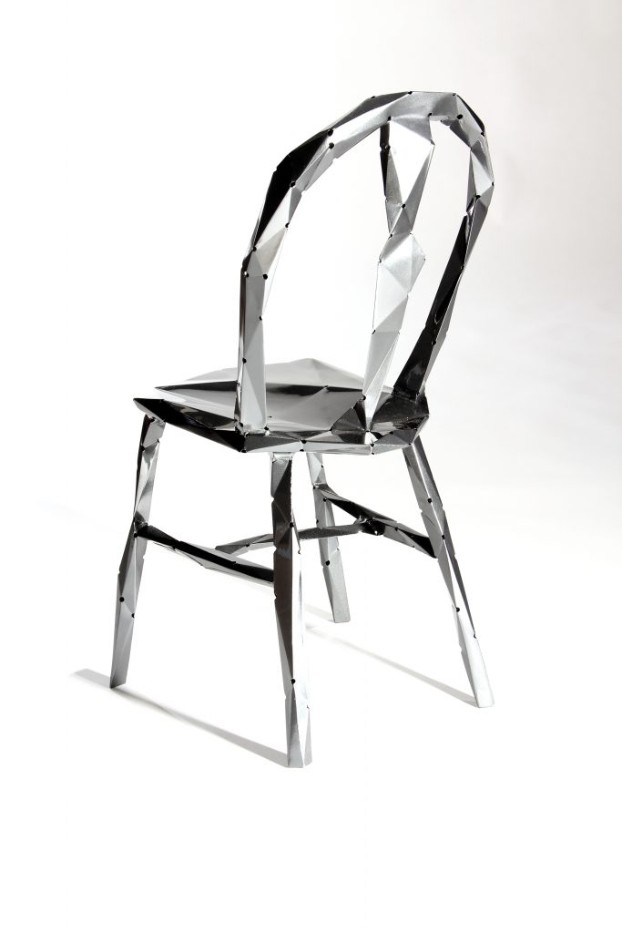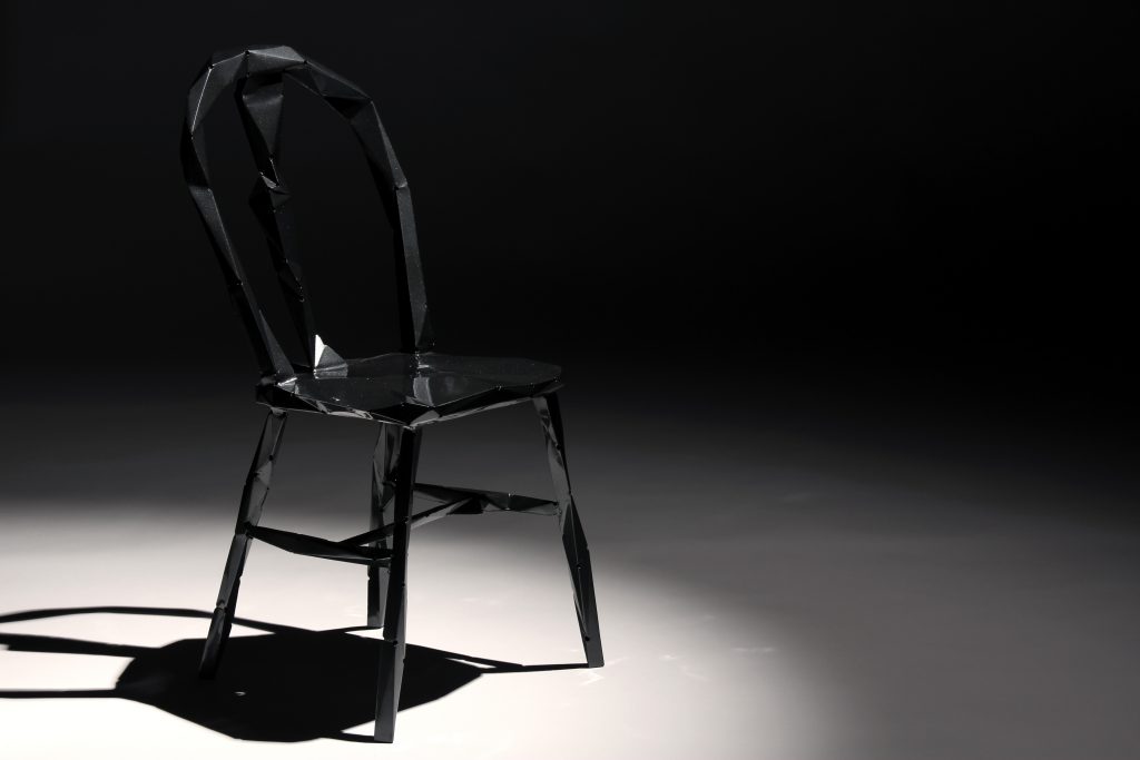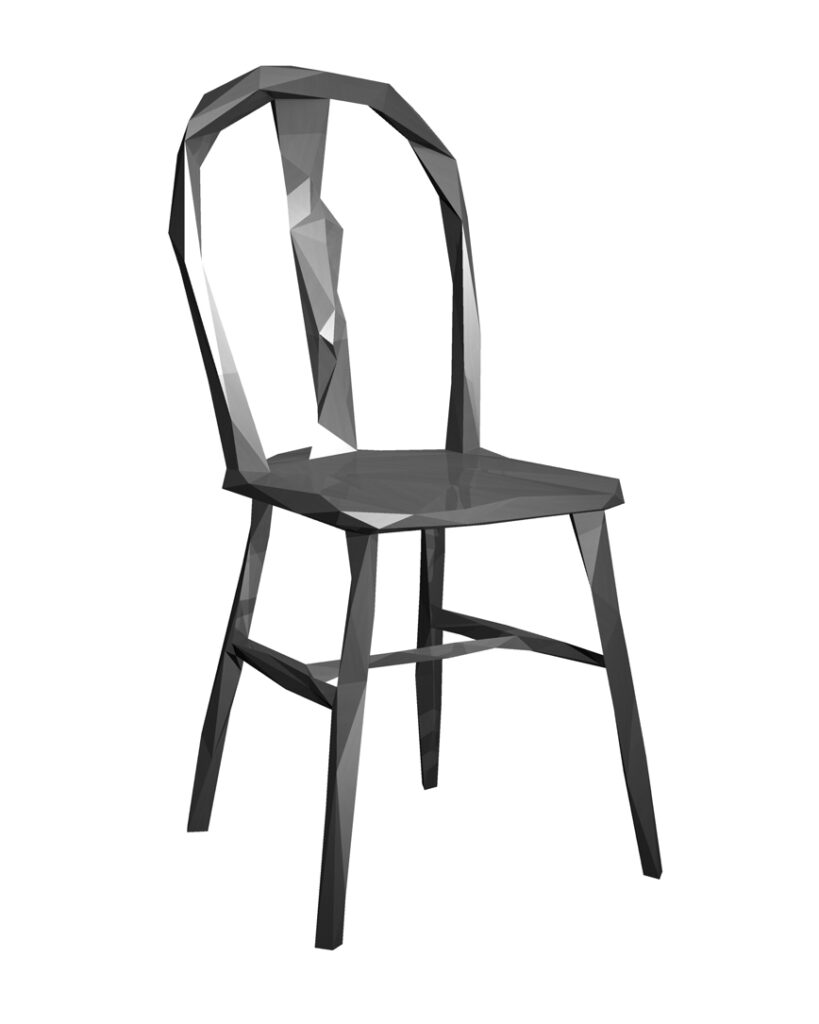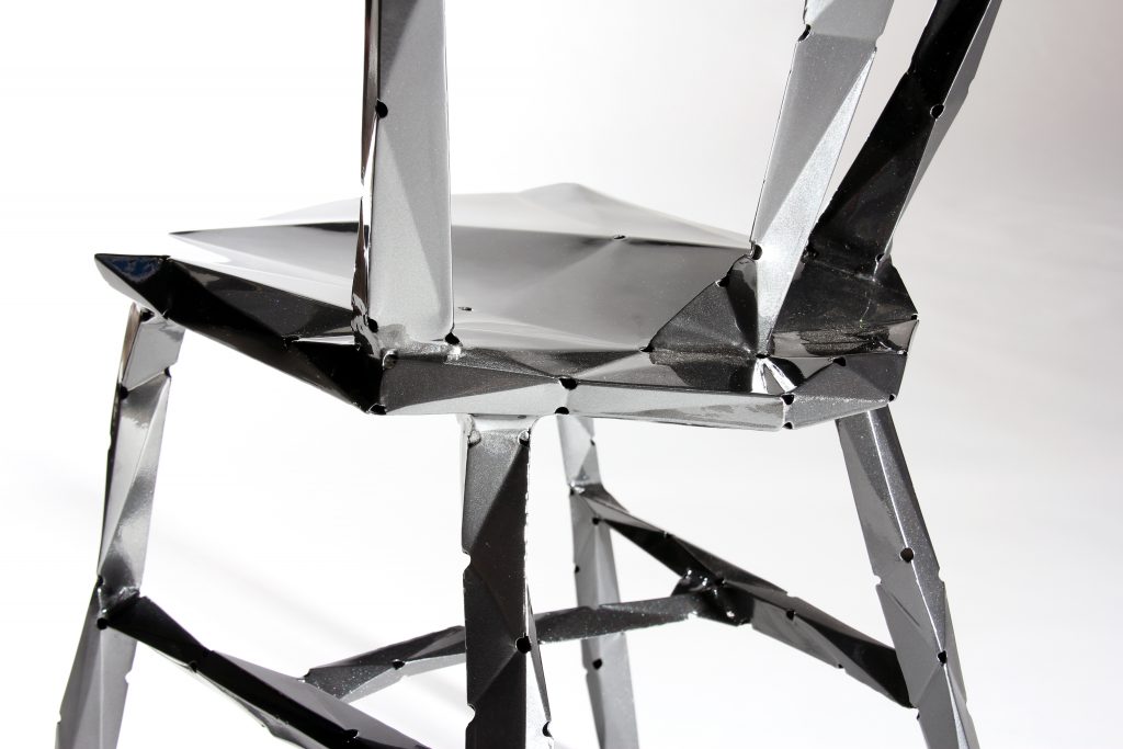 The original Windsor chair was 3D scanned and digitally transformed and its rounded wooden form was distilled into hard angular metal. The folds make 0.9 mm mild steel sheet very strong and together with a shiny car paint they give the chair a jewel-like appearance with its facets reflecting the light so that its form changes slightly from every angle.