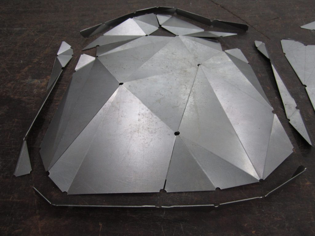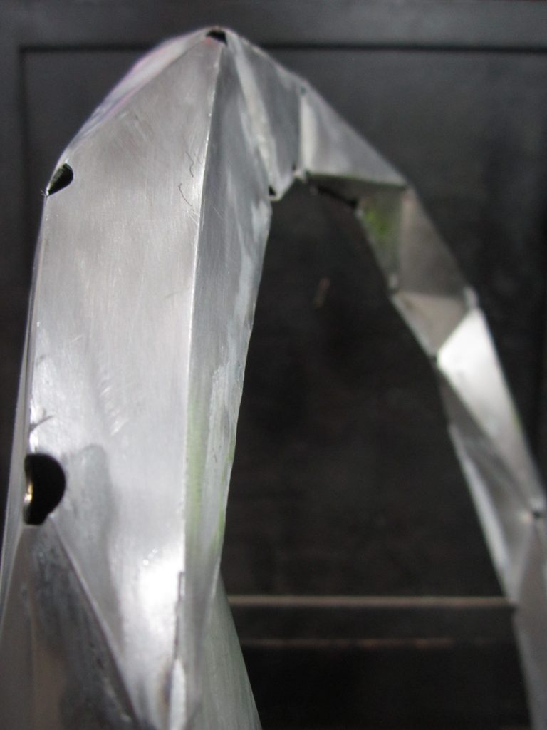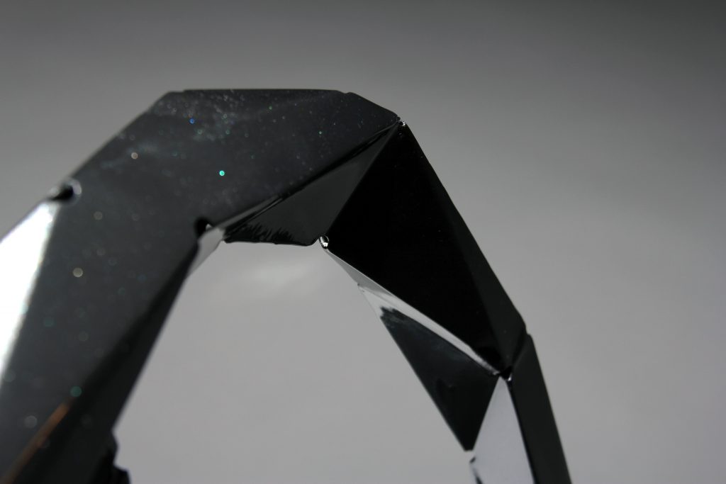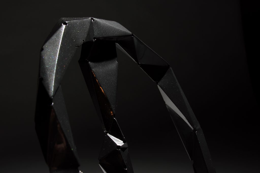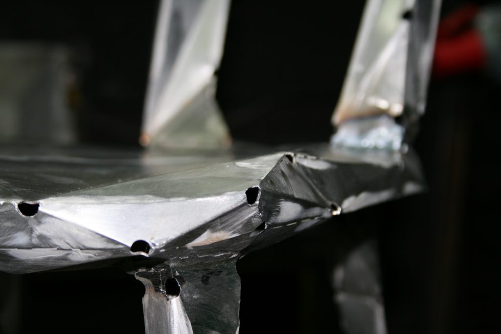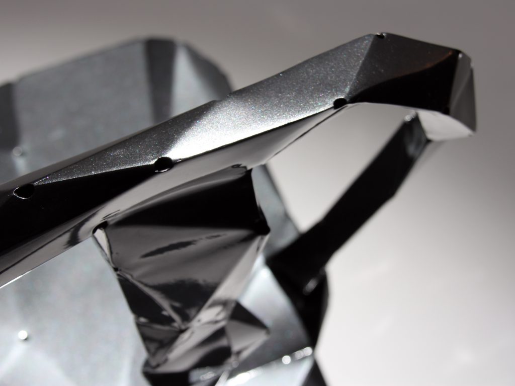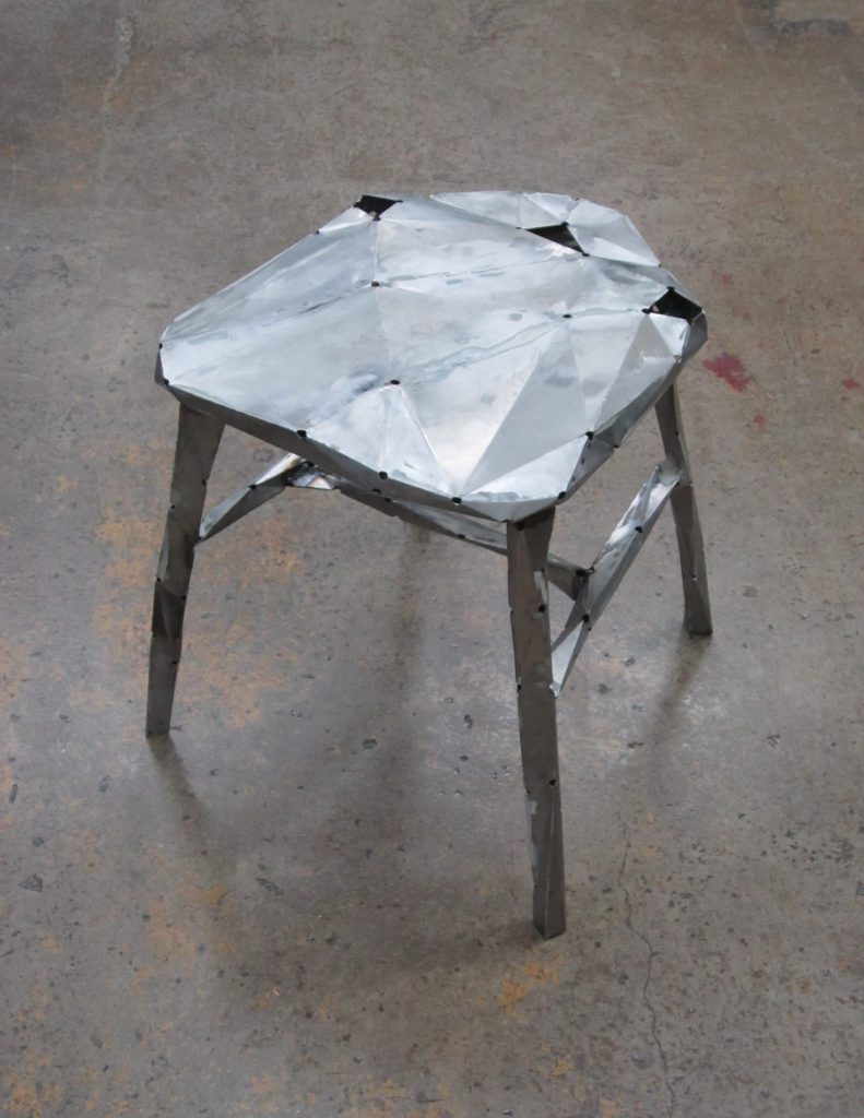 The original Windsor chair was 3D scanned and digitally transformed and its rounded wooden form was distilled into hard angular metal. The folds make 0.9 mm mild steel sheet very strong and together with a shiny car paint they give the chair a jewel-like appearance with its facets reflecting the light so that its form changes slightly from every angle.